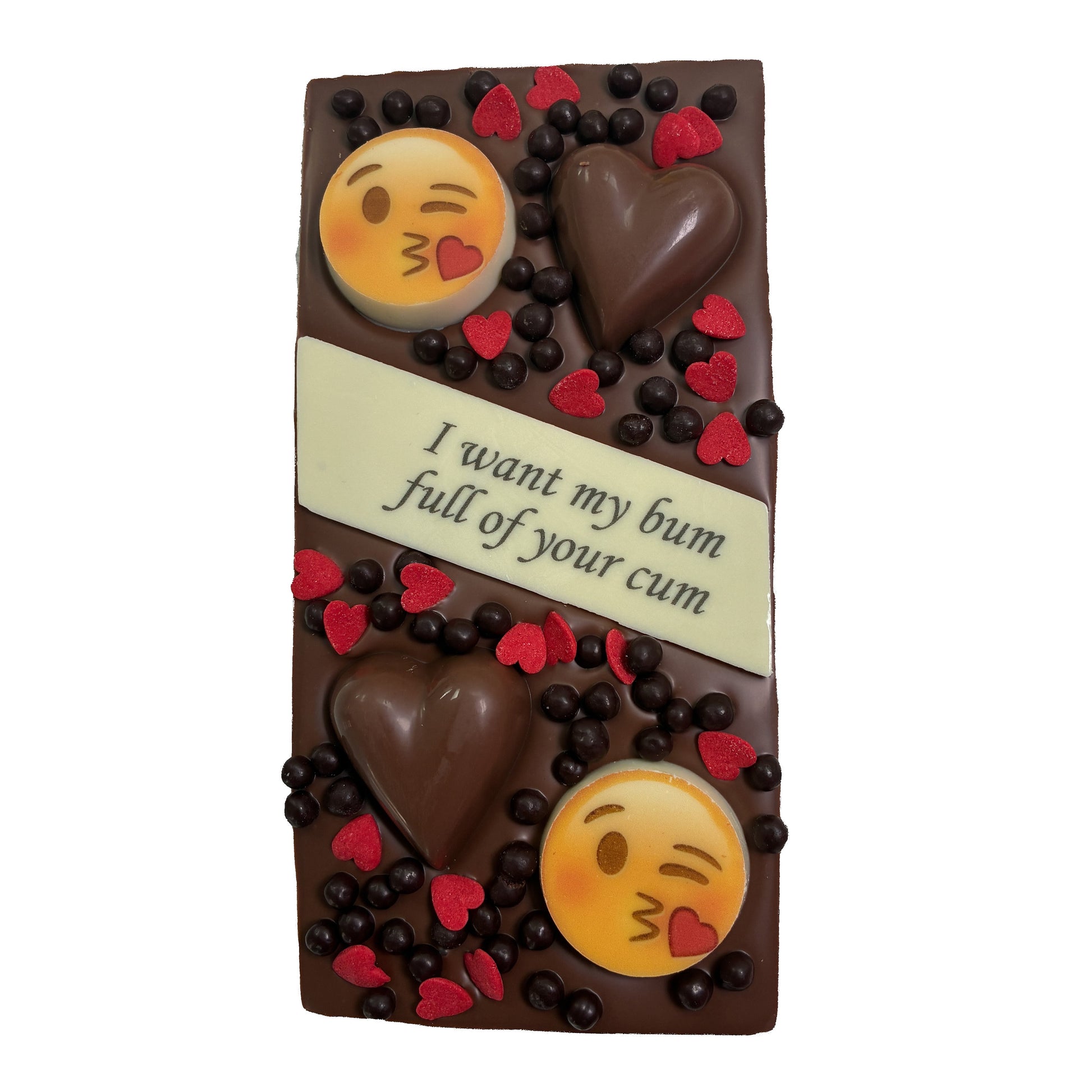 This quirky chocolate gift is definitely going to get a laugh and a huge smile out of your loved one. All our chocolates are made with premium Belgian couverture chocolate so that you are guaranteed to have the most delicious melt-in-your-mouth experience every time. This block has milk chocolate, an edible printed white chocolate plaque saying "I want my bum full of your cum", and topped with edible printed kissy-face emoji chocolates, milk chocolate hearts, red heart sprinkles and dark crispearls.