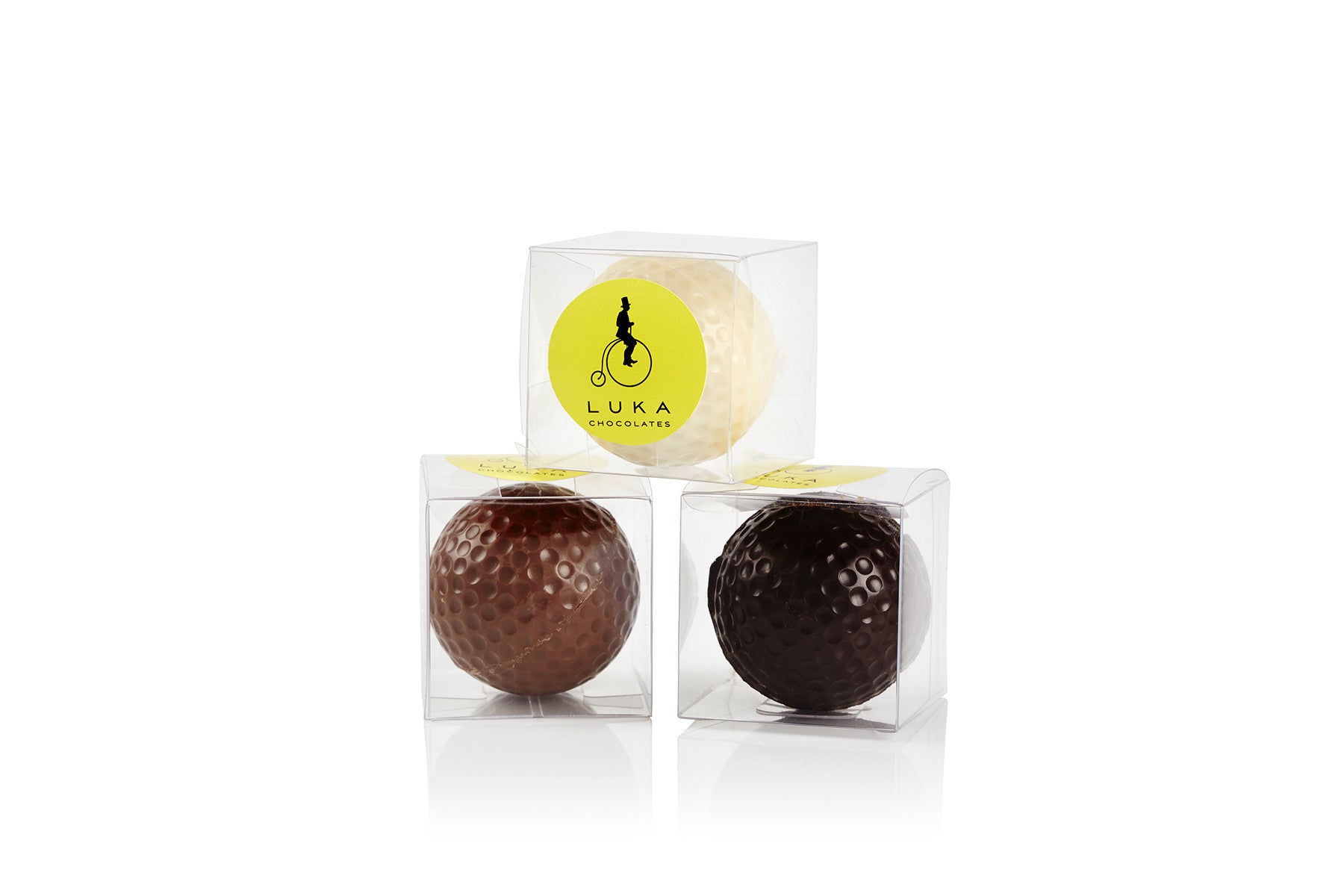 Handmade Belgian chocolate Golf Ball filled with a luxurious praline filling.