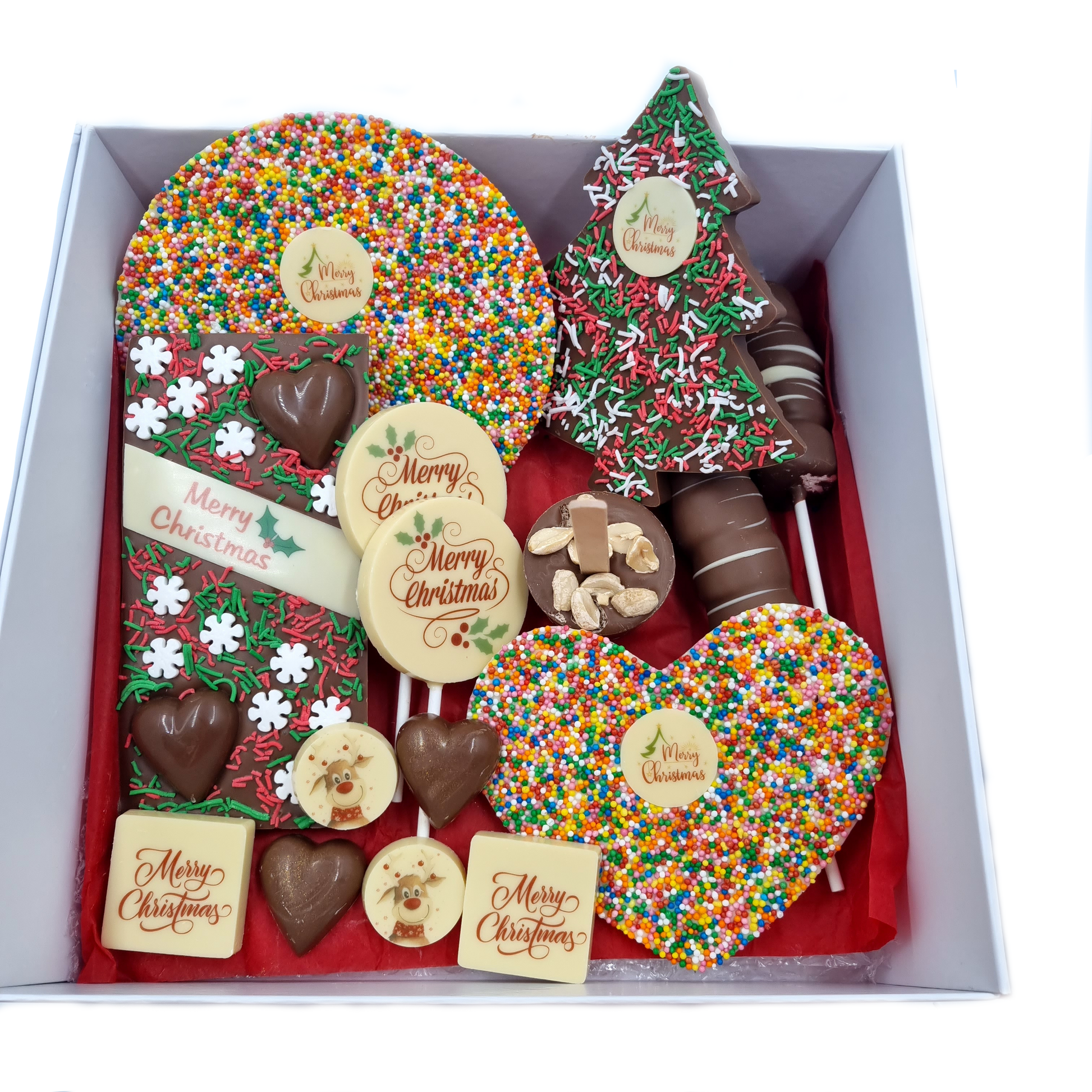 Get festive with our Medium-Sized Christmas Chocolate Hamper! Indulge in our delicious Christmas-themed chocolates, including a chocolate tree, freckle heart, giant freckle, 2 marshmallow sticks, 2 Merry Christmas Chocolate squares, 4 10g milk chocolate hearts, 2 white chocolate lolly pops, 2 white chocolates with reindeer print, and a hot chocolate stick.